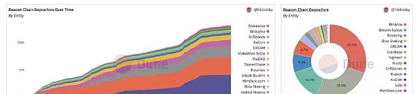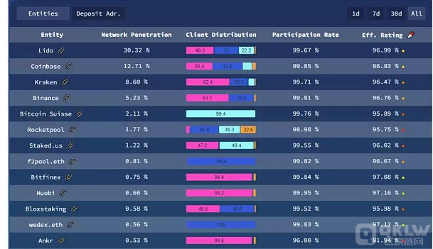 自合并以来,前两名质押服务商合计持有 43.03% 的份额,前三名持有 51.63% 的份额。这里的风险在于,如果 Lido 和 Coinbase 联合起来,可以使网络停止运行;如果 Kraken 也加入,那么三者将可以接管以太坊网络。