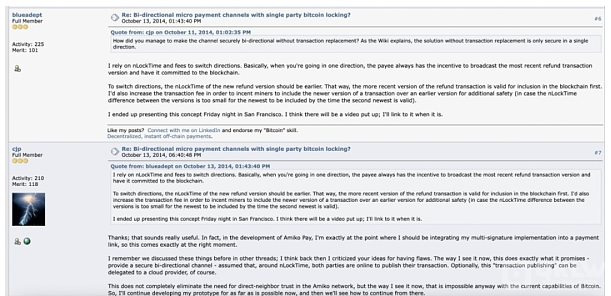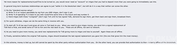 可以看到基于这个提案的讨论围绕的是依靠nLocktime来进行支付角色的转换。举个例子来说,假设Alice和Bob构建了一个双向支付通道。由Alice向Bob支付。假设Alice向Bob转了1 BTC, 同时在这个交易上标记nLocktime为1000, 那么Bob可以反向向Alice支付BTC, 但是Bob发起的这笔交易nlocktime会从1000开始递减,比如是999,并且Bob发起的每笔交易都会减少nLocktime,所以Bob最多只可以发起1000笔交易。