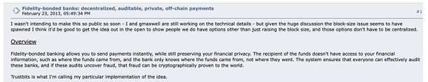 直到2013年4月,Jeremy Spilman搞了一个类似于hashcoin的概念,并且写了一份概念验证代码。由于当时Jeremy提出的这个想法是通过比特币开发邮件组描述的,所以并没有一个明确的名字。后来经由Mike Hearn(上面公开中本聪对支付通道描述的人) 优化,以及bitcoin核心贡献者,blockstream联合创始人,Matt Corallo(Chaincode Labs,由BTC开发者组成的专门建设BTC的实验室)等人的努力下,于2013年6月27日宣布把这个概念加入到了bitcoinj(BTC开发库,许多比特币应用程序和服务都建立在它之上(例如,https://bisq.network/, bitcoin wallet, rsk.co),同样是由Mike Hearn创建)中。