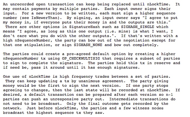 当然,通过这个代码构建的方案还很初级,不过中本聪后来跟bitcoinj开发者Mike Hearn私聊了更多支付通道的细节,并且在2013年,Hearn公开了中本聪对支付通道的解释(如下图)