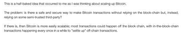 有关前两个大佬提议的具体讨论可以在下面的链接里找到。但是从设计理念来说,两者的思路是非常相像的:基本都是引入一个半可信的中间人(”半可信“是说虽然中间人无法窃取用户资金,但是中间人选择不合作,那么处于Payment network的钱就无法取出),实现一个链下支付网络的功能。Petter Todd在这个基础上加入了隐私的概念,而Gavin的思路则是纯粹解决支付的问题。