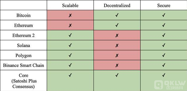 Core为了解决区块链的不可能三角问题,融合了比特币PoW和以太坊DPoS两条链的共识优势,提出了Satoshi Plus共识,完美解决了去中心化、安全性、可扩展性的三角困境。