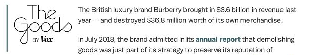 英国奢侈品品牌巴宝莉在去年获得了 36 亿美元的收入——同时它也销毁了 3.68 亿美元等值的商品。