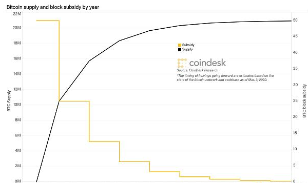 在每次比特币减半事件中,比特币的区块奖励都会被削减一半。