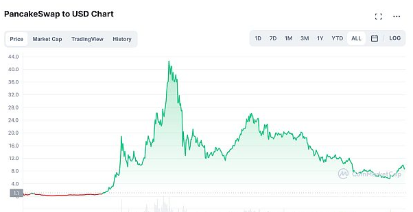 PancakeSwap 的币价在一年前达到顶峰,并一直呈下降趋势。