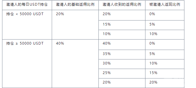 ▪如果邀请人的日均USDT持仓不少于50000枚USDT,基础返佣率将增至40%,邀请人可选择与受邀好友分享其中的0%、5%、10%、15%或20%。