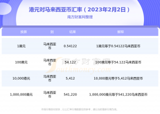 腾赚网为您提供港元兑换马来西亚币汇率最新价格详情。 2023年2月2日,货币兑换:1港元=0.54122马来西亚币。如:1港元、2港元、5港元、10港元、20港元、50港元、100港元,分别折合马来西亚币0.54122、1.08244、