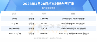 腾赚网为您提供卢布兑换新台币汇率最新价格详情。 2023年1月28日卢布换新台币的汇率为:0.56095 2023年1月28日新台币换卢布的汇率为:1.78269 根据今日汇率:1卢布、2卢布、5卢布、10卢布、20卢布、50卢