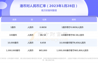 今日港元对人民币汇率表 当前汇率0.8663 港元100 人民币86.6300 Tips:100港元兑换86.6300人民币 汇率更新时间:2023/1/28 11:42:32 2023年1月20日银行间外汇市场人民