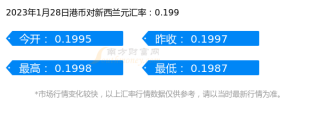 腾赚网为您提供港币对新西兰元汇率最新价格详情。 2023年1月28日最新消息,港币兑换新西兰元最新汇率为0.199,今开为0.1995,昨收为0.1997,最高为0.1998,最低为0.1987。 2023年1月28日港币相关